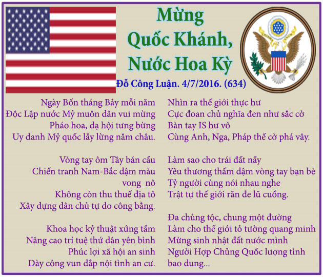 Khuya tối qua, tôi ngồi xem trực tiếp Đại Hội trung học Ngô Quyền trên trang web ngo-quyen.org, chợt thấy lá cờ nước Mỷ, nhớ ra 4/7 là Quốc Khánh nước Cờ Hoa. Thế là bài thơ ra đời, gửi đi, cũng vừa kịp lúc Đại Hội khai mạc. Xin cám ơn Thầy Cô, bạn bè của tôi có ngày họp mặt vui, ngày cận kề quốc khánh Hợp Chủng Quốc Hoa Kỳ....ĐCL