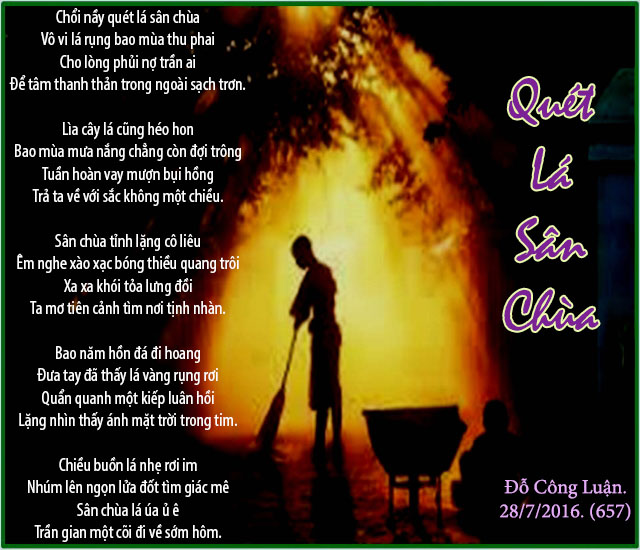 Xin cám ơn BĐH trang nhà đã giới thiệu bài thơ đến mọi người. Xin cám ơn vi hữu Phương Võ đã cho ý kiến. Như chiếc lá mùa Thu, đời người cũng có ngày tàn tạ, héo úa và về với mênh mông. Buổi chiều, cuối ngày, nơi tỉnh lặng của sân chùa để ta chiêm nghiệm về cuộc đời...Trân quí. ĐCL