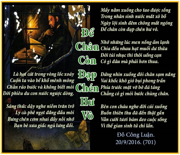 Xin cám ơn BĐH trang nhà đã giới thiệu bài thơ. Xin cám ơn vi hữu Chính Hồ đã đọc bài thơ và nhận xét. Đúng là tôi sở trường về lục bát. Thỉnh thoảng cũng có bài về 7 chữ và 5 chữ. Sau cuộc chiến tranh, ai còn sống là điều phước đức, như ba tôi đã nói vậy. Cả dòng họ tôi không ai bị thương, mất tích, và chết. 14 tháng ở chiến trường, đôi lần tôi cũng suýt chết. Đạn tránh người, người không tránh đạn. Xin cám ơn đồng đội đã ngã xuống để cho tôi cuộc sống hôm nay, dù có nhiều bề bộn, lo toan. Xin cám ơn đời. Trân quí. ĐCL