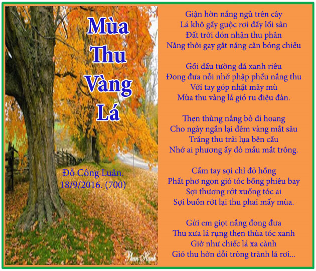 Xin cám ơn BĐH trang nhà đã giới thiệu bài thơ. Xin cám ơn vi hữu Chính Hồ đã đọc, và có lời bình về bài thơ. Tôi quan niệm, làm thơ phải xứng tầm, nghĩa là câu chữ phải trau chuốt, vần điệu phải mạch lạc, chứ không thể viết theo ngẩu hứng rồi phá điệu. Thơ phát ra từ trái tim mình, và phải có nghệ thuật, đôi khi có sự sắp đặt nghĩa bóng, nghĩa đen, để người đọc thấy rõ ý thơ. Xin cám ơn về lời bình. Trân quí. ĐCL