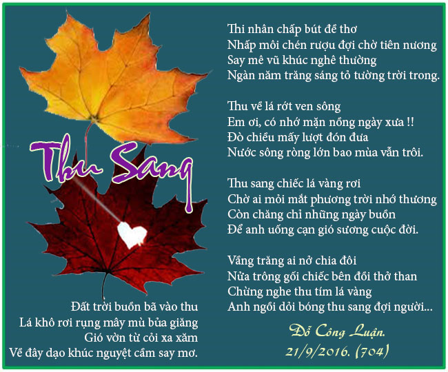 Tính từ đầu thu đến nay tôi đã có 11 bài thơ viết về mùa thu. Dù mùa thu buồn, nhưng cũng cho tôi nhiều cảm xúc để nói lên nỗi niềm và đồng cảm với thu.