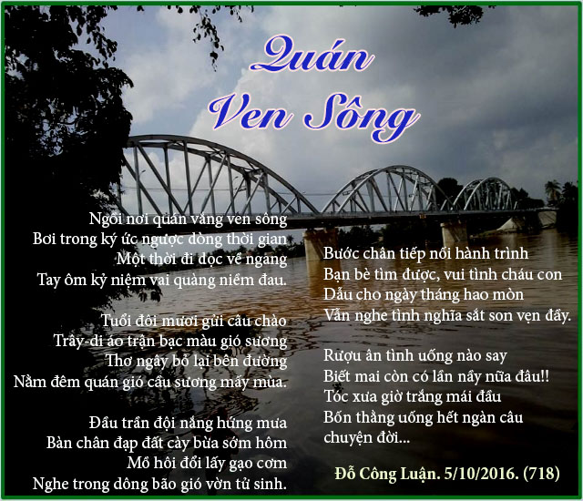 Xin cám ơn BĐH trang nhà đã giới thiệu bài thơ đến mọi người. Những đứa bạn từ 2 đầu nỗi nhớ gặp nhau bên dòng sông quê hương để cạn niềm tâm sự. Thời gian đã mấy mươi năm nhưng vẫn còn hoài kỷ niệm. Hình nền là cây cầu Gành mới của quê tôi giờ chỉ là 3 nhịp. Cầu Gành 4 nhịp cong cong chỉ còn trong ký ức. Mai nầy ai còn nhớ chăng...ĐCL