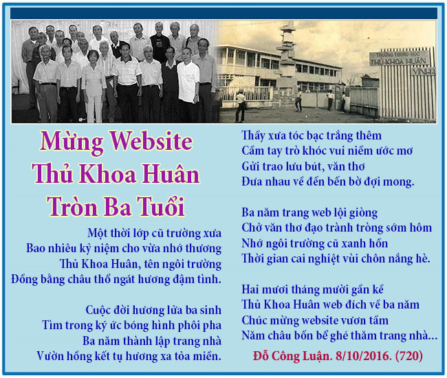Thưa quý ACE, Dù không là học sinh của trường TKH/VL, nhưng tôi cũng có 14 tháng ở vùng đất Vĩnh Bình, Trà Vinh, vùng đất cho tôi nhiều kỷ niệm. Là cọng tác viên của trang nhà, với điều kiện cuộc sống, tôi cũng đã có nhiều thơ văn được giới thiệu trên trang web nhà, thi hữu gần xa. Nhân dịp kỷ niệm 3 năm thành lập trang thukhoahuan.com, xin kính chúc trang nhà tiến xa, tiến nhanh trên net. Kính chúc Ban Điều Hành trang web của trung học TKH/VL dồi dào sức khỏe để phục vụ cộng đồng. Trân quý. ĐCL