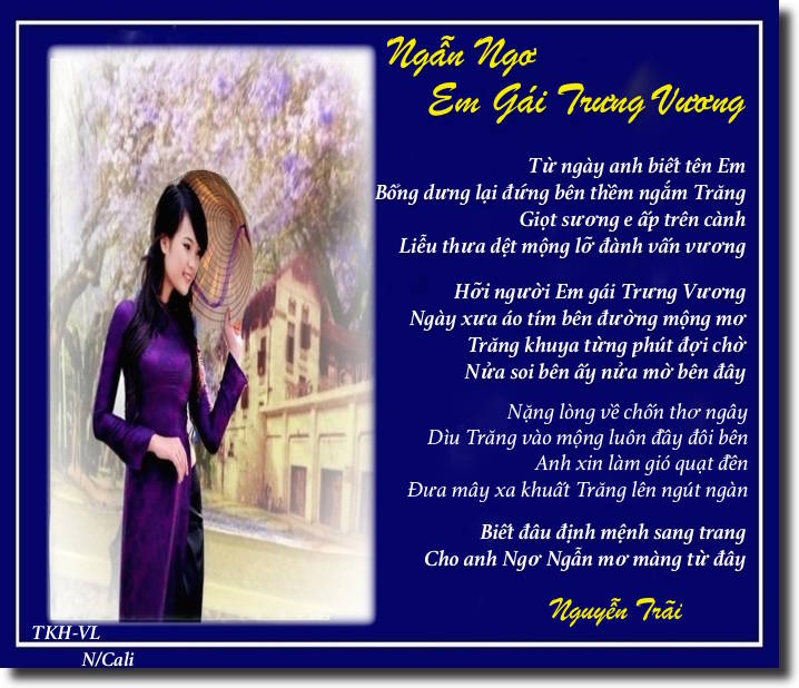 Lời óng ả tựa tơ Làng lụa Hội An. Âm ba lục bát loang loáng tiễn vía người phiêu diêu lên đồi cây ngọn cỏ. Bài thơ gợi nhớ chuyện xưa. Có dạo người đọc làm việc xéo Trường nữ Trưng Vương, SG. Cứ vào tầm tan trường, người ra đứng lan can lầu nhìn xuống. Nhìn chiếc nón lá nghiêng vành, nhìn tà áo truyền thống bay bay theo gió nhẹ, lòng lâng lâng một niềm yêu khó tả: Tổ quốc ta sao mà văn hiến thế! Kinh lạy Tổ quốc cửu trường! Xin Người phù hộ chúng con đời đời biết lửa hương Hồn nước, gìn giữ thuần phong, viết nên những dòng lục bát tuyệt diệu xưng tụng Quê hương vô cùng yêu dấu và đặc biệt là từ đây biết ' Ngơ ngẩn mơ màng'./.