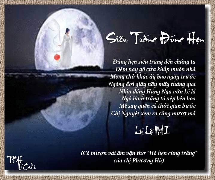 Theo Đào D. Anh, từ Hán Viêt 'siêu' có nghĩa là 'Nhẩy lên - Cao vượt lên - Vượt qua' và thường được ghép với một từ Hán Việt khác. Nhưng bây giờ, tại VN, tư 'siêu' được dùng cực kỳ rộng rãi, nhứt là trong quảng cáo: siêu sạch, siêu rẻ, siêu mỏng... và đây là'siêu trăng'. Phải suy nghĩ một hồi mới hiểu 'siiêu trăng' là gì. À, thì ra , Nhà thơ muốn nói con Trăng rằm đặc biệt tháng 10 Bính Thân vừa qua. Nghe nói mấy mươi năm mới có 1 lần. Thôi, chắc là vĩnh viễn không coi được rồi! Chờ kiếp sau, nếu vẫn còn được làm người. Nhà thơ háo hức đợi chờ thời điểm nầy từ mấy tháng trước. Chị Nguyệt cũng tỏ ra hứng khởi 'mượt mà'. Bài thơ Đường miêu tả tốt hoạt cảnh Trăng lên vào một đêm đặc biệt. Tất cả đều chỉn chu chỉ trừ liên (2 câu) luận có chút vướng víu về ý (luân) cũng như về lời (đối)./.