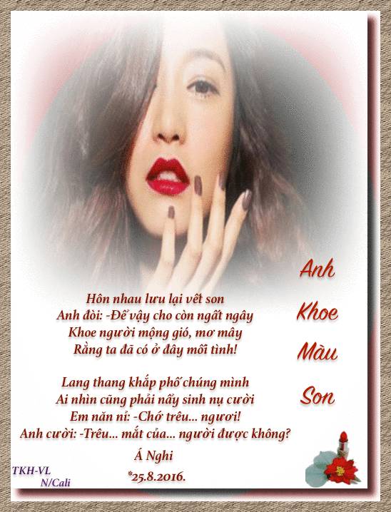 Tám câu lục bát biểu hiện trung thực tình yêu đôi lứa của thời son trẻ. Ôi! còn gì sung sướng bằng lần đầu được một thiếu nữ trong trắng, ngây thơ để ý và xác nhận tình yêu bằng nụ hôn tươi thắm vết son. Hương hạnh phúc tình yêu trêu ngươi, trêu mắt, tỏa lan trong khí quyển, xâm nhập vào thể tạng, khiến ai cũng vui vui: Ai nhìn cũng phải nẩy sinh nụ cười. 'Anh khoe màu son' đem đến cho ta niềm vui vui,là lạ. Đó là thành công của Nhà thơ./.