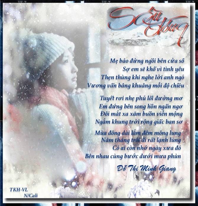 MG thành thật cám ơn BBT/TKH đã gới thiệi bài thơ Sầu Đông được Nắng Cali .thực hiện tranh thơ rất xinh , cám ơn Nắng nhiều . Nhờ Nắng Cali mang dùm chút nắng xuống vùng dưới này đang vào Đông lạnh lùng . Tình thân, ĐTMG