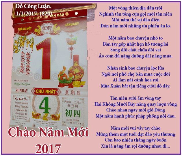 Xin cám ơn BBT trang nhà đã giới thiệu bài thơ đến mọi người. Xin cám ơn vi hữu Nghiêm Nguyễn, chị MG đã chia sẻ về bài thơ của tôi mừng năm mới 2017 Xin thân chúc BBT trang nhà, quý ACE của trang web nhà, một năm mới 2017 nhiều an lạc, hạnh phúc trong cuộc sống mỗi ngày của năm. Trân quý. ĐCL