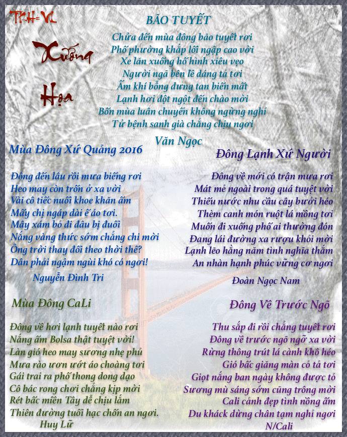 Trong năm bài TNBC. Đường luật, chỉ xin đóng góp ý kiến 2 bài:Xướng của Văn Ngọc và họa của N/cali. Bởi đó là các bài thảo nhân tâm đắc. Nếu bỏ qua chút đối lợn cợn ở cặp luận thì bài thơ có thể coi là hoàn chỉnh. Lời dung dị. Nhịp thuận hòa. Hay. Tương tợ, 'Đông về trước ngõ', về đối ngẫu, cặp luận cũng có phần gò bó. Ngoài ra, các 'phép tắc còn lại cũng rất chỉn chu. Hay. Gìn vàng giữ ngọc cho tiền nhân cũng là hình thái nhớ nước yêu nhà cần được trân quý./.