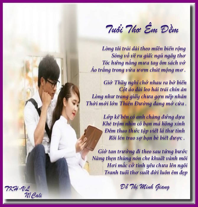 MG cám ơn Nắng Cali đã thực hiện TT rất dễ thương, OO^i, tuổi học trò học trắng Thiên Đường của tuổi hồn nhiên, đã qua, đã xa khuất tầm tay, không bao giờ tìm lại được . Chỉ còn niềm thương cảm trong tâm khảm mà thôi . MG cám ơn BBT/TKH đã giới thiệu . Kính , MG