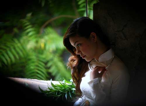 Em ngồi, nhìn chiếc lá vàng rơi.