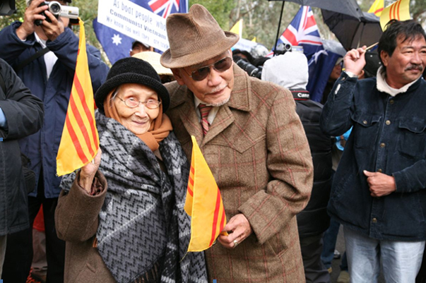Cụ bà gần 100 tuổi bên cạnh tác giả trong ngày biểu tình Quốc Hận tại thủ đô Canberra, Úc Đại Lợi. (2011)