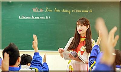 Cô giáo đứng trước bảng đen,