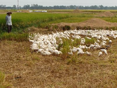 Bầy vịt mấy hôm nay trông khác lạ, lông cánh bắt đầu mọc, một số mọc lông đuôi nhìn kỹ có thể phân biệt được trống mái. Đàn vịt bắt đầu ăn lúa, đa số không trở ngại, một số nhỏ dường như chưa quen lắm, nhưng ba tôi và chú Ba quyết định hôm sau lùa chúng đến đám ruộng đã thu hoạch xong. Vừa tới nơi chúng bu quanh chỗ đặt bồ đập lúa mấy ngày trước, lúa đ xung quanh nhiều lắm vịt tha hồ lượm thóc, thức ăn dư dã khiến con nào cũng no nê, dù tới giờ chúng tiếp tục ăn khộng buồn đòi về như hôm qua. Tôi hỏi chú Ba nên lùa về như hàng ngày hay cứ để nó tại chỗ nầy. Chú cho biết đường về chuồng gần, nên lùa về để mỗi lần ăn no là chúng nhớ đường về.