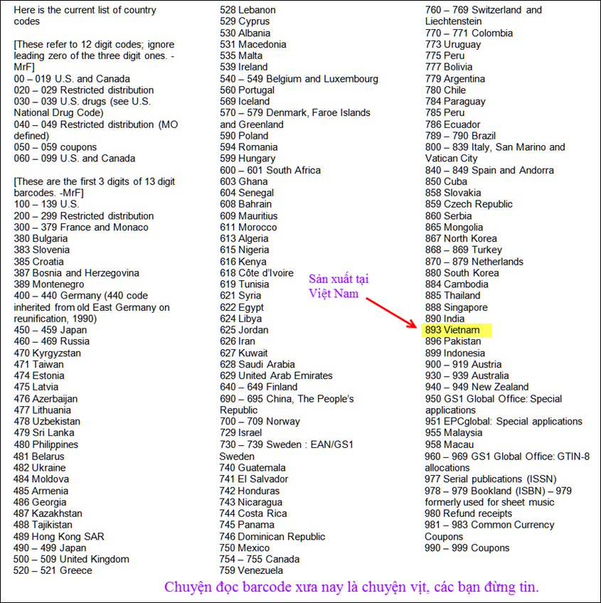 Hàng chục lần tôi nới với các bạn là barcode không nói được xuất xứ với kiểu làm ăn đa quốc gia hiện giờ. Thí dụ nước mắm Trung Quốc làm dỏm mang sang Phú Quốc vô chai, chở qua Mỹ ghi rên chai sản xuất tại Phú Quốc Việt Nam ai mà kiện. Tuy nhiên với món chúng ta thấy thì cái barcode nó ghi là
