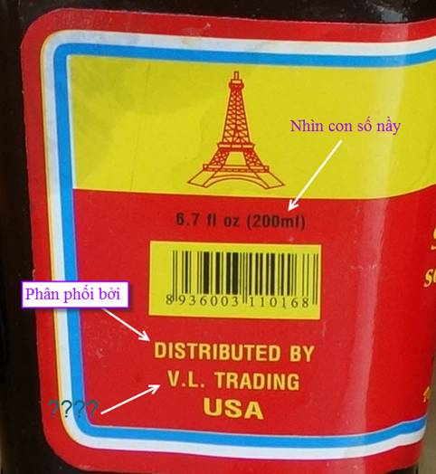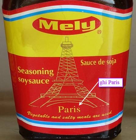 Vậy thì chai nước tương nầy làm tại Việt Nam ghi là sản xuất tại Pháp, dùng chữ Tây và chữ Mỹ trên nhãn.
