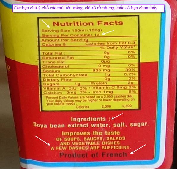 Các bạn nghĩ sao về hàng chữ: Vegetable and salty meals are used trên cái nhãn chánh chai giữa (nhỏ). Tiếng Anh nầy ba trợn quá chừng. Tôi đoán ý của tác giả cái nhãn nầy muốn nói "ăn chay ăn mặn gì cũng dùng được hết". Ông Tây ơi, nếu quả cái món nầy do mấy ông làm thì tôi lấy làm buồn giùm cho nước Pháp. Buồn là sao? Thưa buồn rằng (thìa là) cho tới bây giờ nước Pháp chỉ mới đuổi theo kịp nước Tàu về tiếng Anh.
