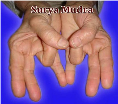 Với những ai đang quan tâm đến việc giảm cân đều có thể tập thủ ấn này. Ngoài ra, Surya Mudra còn giúp giảm cholesterol, tăng khả năng tiêu hóa và giảm tình trạng căng thẳng, lo lắng. Để thực hiện được động tác này rất đơn giản, bạn chỉ việc gập ngón áp út lại rồi dùng ngón tay cái nhấn vào đốt thứ hai của ngón áp út.